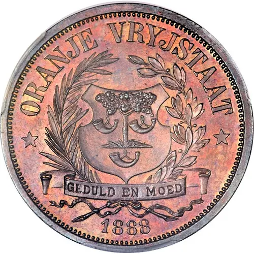 Obverse lettering ORANJE VRYJSTAAT GEDULD EN MOED 1888