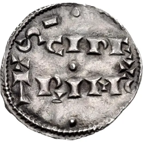| Beschrijving voorzijde | Two line inscription, pellets above and below, pellet and two crosses between. |
