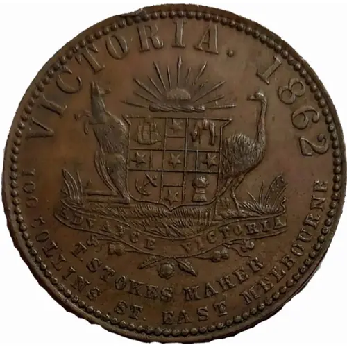 | Obverse lettering | VICTORIA 1862 ADVANCE VICTORIA T. STOKES MAKER 100 COLLINS ST.EAST MELBOURNE |