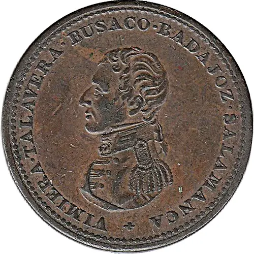 | Obverse description | Uniformed bust of the Duke of Wellington left. Lettering (Spanish campaigns) around, beaded border |