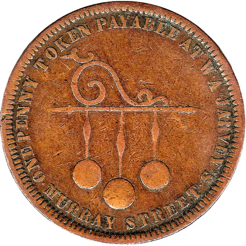| Obverse lettering | ONE PENNY TOKEN PAYABLE AT W.A. JARVEY`S MURRAY STREET |