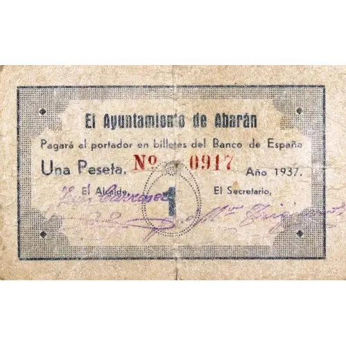 El Ayuntamiento de Abarán Pagará al portador en billetes del Banco de España Una Peseta Año 1937. 1 (Translation: The City Council of Abarán Will pay the bearer in banknotes of the Bank of Spain One Peseta Year 1937) |