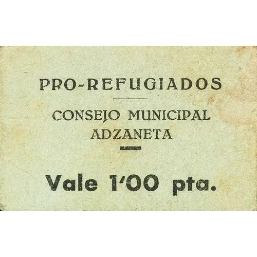 PRO-REFUGIADOS CONSEJO MUNICIPAL ADZANETA Vale 1`00 pta. (Translation: Pro-refugees Municipal Council Adzaneta It`s worth 1.00 Peseta) |
