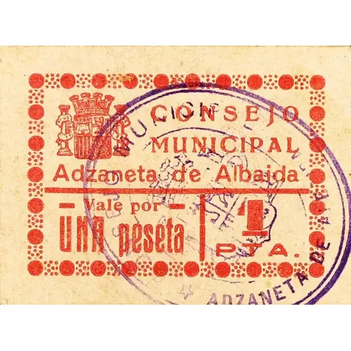 CONSEJO MUNICIPAL Adzaneta de Albaida Vale por UNA peseta 1 PTA. (Translation: Municipal Council Adzaneta de Albaida Voucher for One Peseta 1 Peseta) |