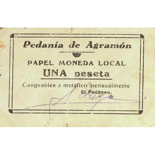 | Obverse lettering | Pedanía de Agramón PAPEL MONEDA LOCAL UNA peseta Cangeables a metálico mensualmente (Translation: District of Agramón Local paper currency One Peseta Exchangeable for cash monthly) |