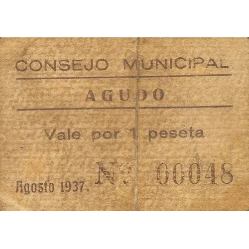 CONSEJO MUNICIPAL AGUDO Vale por 1 peseta Agosto 1937. (Translation: Municipal Council Agudo Valid for 1 Peseta August 1937.) |