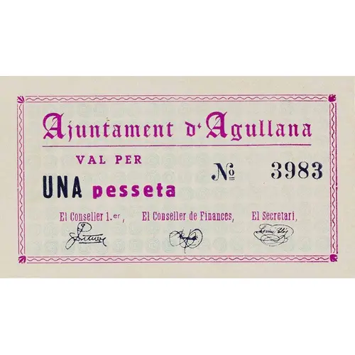 (Translation: The City Council of Agullana Will pay the bearer One Peseta)
