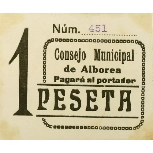 | Obverse lettering | Consejo Municipal de Alborea Pagará al portador 1 PESETA (Translation: Municipal Council of Alborea Will pay the bearer 1 Peseta) |