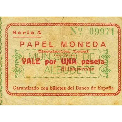 | Ön yüz lejandı | PAPEL MONEDA Circulación Local MUNICIPIO DE ALBUDEITE VALE por UNA peseta Garantizado con billetes del Banco de España (Translation: Paper Money Local circulation Municipality of Albudeite Voucher for One Peseta Guaranteed with banknotes from the Bank of Spain) |