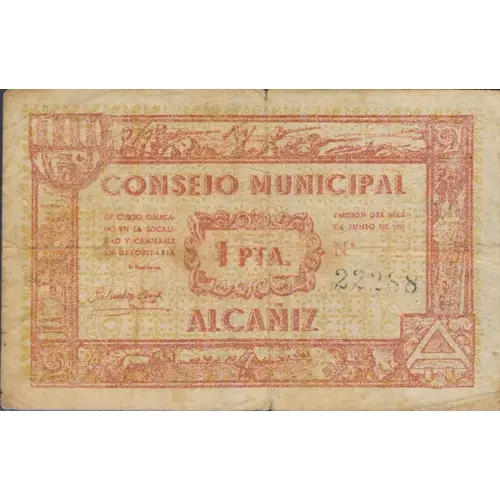 CONSEJO MUNICIPAL DE CURSO OBLIGADO EN LA LOCALIDAD Y CANJEABLE EN DEPOSITARIA 1 PTA. EMISIÓN DEL MES DE JUNIO DE 1937 ALCAÑIZ (Translation: Municipal Council Mandatory course in the locality and exchangeable in depositary 1 Peseta Issue of the month of June 1937 Alcañiz) |