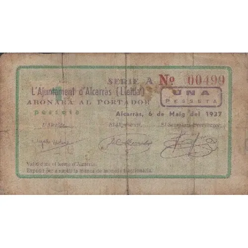 Legenda del dritto L`Ajuntament d`Alcarràs (Lleida) ABONARÁ AL PORTADOR UNA PESSETA Alcarràs, 6 de Maig del 1937 Vàlid dins el terme d`Alcarràs. Expedit per a suplir la manca de moneda fraccionària.