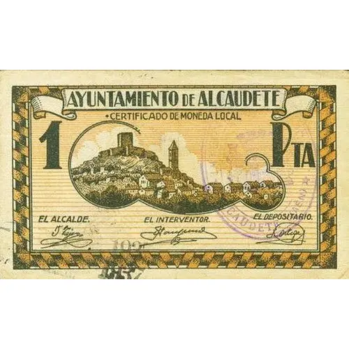 AYUNTAMIENTO DE ALCAUDETE CERTIFICADO DE MONEDA LOCAL 1 PTA (Translation: City Council of Alcaudete Local currency certificate 1 Peseta) |