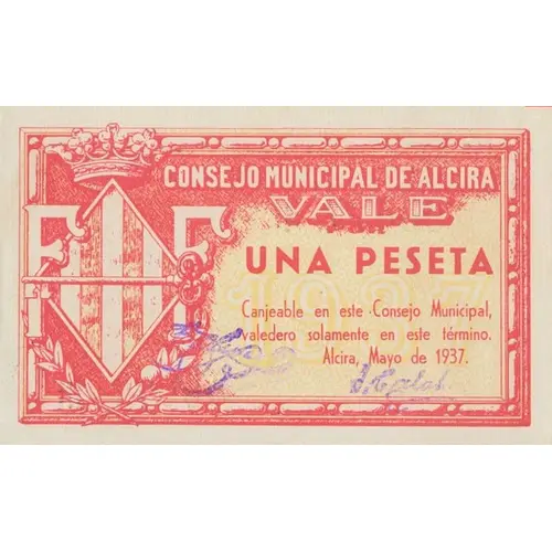 CONSEJO MUNICIPAL DE ALCIRA VALE UNA PESETA Canjeable en este Consejo Municipal, valedero solamente en este término. Alcira, Mayo de 1937. (Translation: Municipal Council of Alcira Value One Peseta Redeemable in this Municipal Council, valid only in this term. Alcira, May 1937.) |