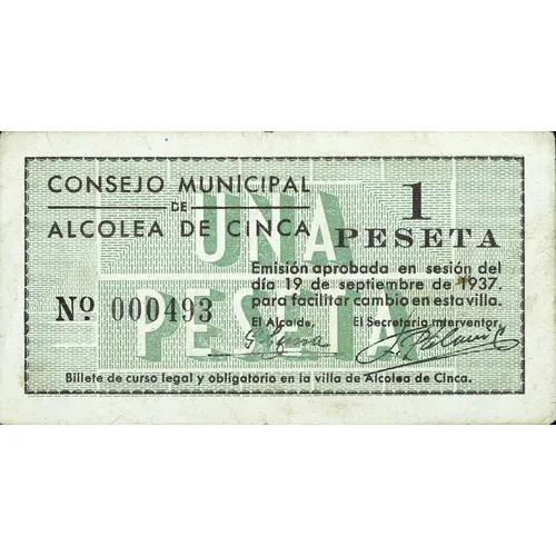CONSEJO MUNICIPAL DE ALCOLEA DE CINCA 1 PESETA Emisión aprobada en sesión del día 19 de septiembre de 1937, para facilitar cambio en esta villa. Billete de curso legal y obligatorio en la villa de Alcolea de Cinca. (Translation: Municipal Council of Alcolea de Cinca 1 Peseta Issue approved in session on September 19, 1937, to facilitate change in this town. Legal and mandatory tender in the town of Alcolea de Cinca.) |