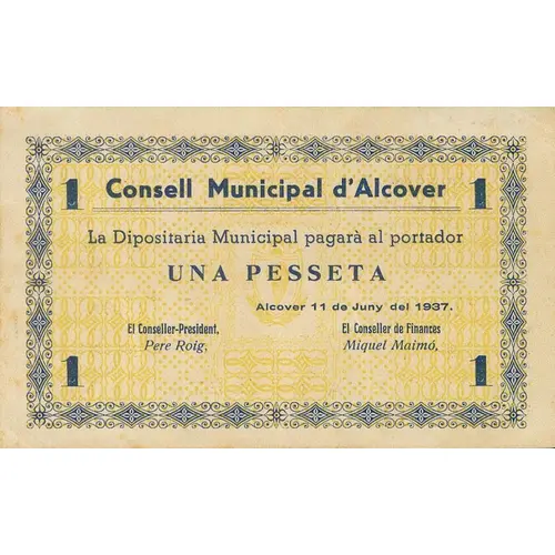 1 Consell Municipal d`Alcover La Dipositaria Municipal pagarà al portador UNA PESSETA Alcover 11 de Juny del 1937. (Translation: Municipal Council of Alcover The Municipal Depository will pay the bearer One Peseta Alcover June 11, 1937.) |