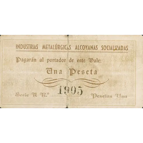 INDUSTRIAS METALÚRGICAS ALCOYANAS SOCIALIZADAS Pagarán al portador de este Vale: Una Peseta Serie A Pesetas Una (Translation: Socialized Alcoyan Metallurgical Industries They will pay the bearer of this Voucher: One Peseta) |