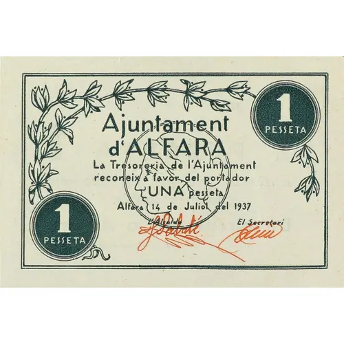 | Obverse lettering | 1 PESSETA Ajuntament d`ALFARA La Tresoreria de l`Ajuntament reconeix a favor del portador UNA pesseta Alfara 14 de Juliol del 1937 (Translation: 1 Peseta City Council of Alfara The Treasury of the City Council recognizes in favor of the bearer One Peseta Alfara July 14, 1937) |