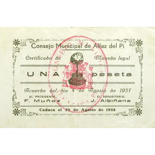 Consejo Municipal de Alfaz del Pi Certificado de Moneda legal UNA peseta Acuerdo del día 4 de Agosto de 1937 Caduca el 30 de Agosto de 1938 (Translation: Municipal Council of Alfaz del Pi Legal Currency Certificate One Peseta Agreement of August 4, 1937 Expires August 30, 1938) |