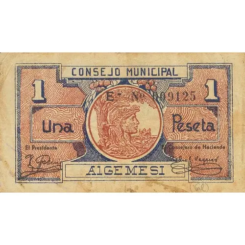 CONSEJO MUNICIPAL 1 Una Peseta ALGEMESI (Translation: Municipal Council One Peseta Algemesi) |