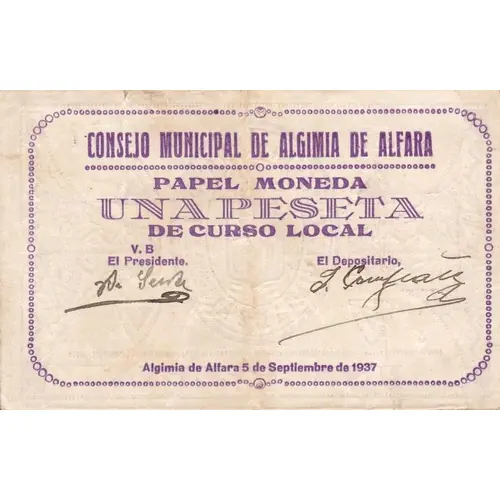 CONSEJO MUNICIPAL DE ALGIMIA DE ALFARA PAPEL MONEDA UNA PESETA DE CURSO LOCAL Algimia de Alfara 5 de Septiembre de 1937 (Translation: Municipal Council of Algimia de Alfara Paper money One Peseta of local course Algimia de Alfara, September 5, 1937) |