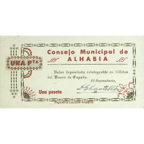 Consejo Municipal de ALHABIA UNA PTA Valor depositado reintegrable en billetes del Banco de España. Una peseta Papeleria Lacoste - Almeria (Translation: Municipal Council of Alhabia One Peseta Deposited value refundable in Bank of Spain notes. One Peseta) |