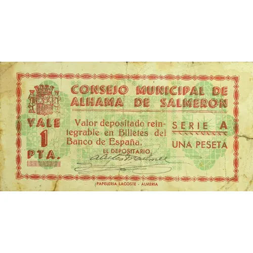 CONSEJO MUNICIPAL DE ALHAMA DE SALMERON VALE 1 PTA. Valor depositado reintegrable en Billetes del Banco de España. SERIE A / UNA PESETA PAPELERIA LACOSTE - ALMERIA (Translation: Municipal Council of Alhama de Salmerón Value 1 Peseta Amount deposited refundable in banknotes of the Bank of Spain. Series A / One Peseta) |