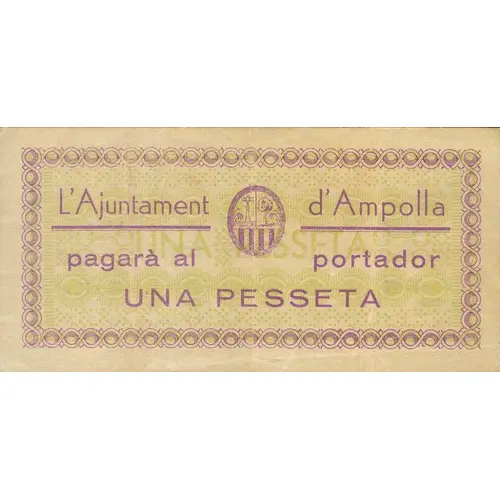 L`Ajuntament d`Ampolla pagarà al portador UNA PESSETA (Translation: The City Council of Ampolla will pay the bearer One Peseta) |