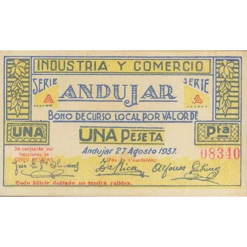 (Translation: Industry and Commerce / Andujar Local course voucher value of One Peseta Andujar August 27, 1937. They will be exchanged for fractions of Five Pesetas Any folded banknote will not be valid.)