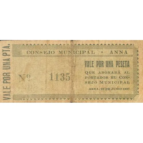 VALE POR UNA PTA. CONSEJO MUNICIPAL - ANNA VALE POR UNA PESETA QUE ABONARÁ AL PORTADOR EL CONSEJO MUNICIPAL ANNA, 28 DE JUNIO 1937 (Translation: Value for One Peseta Municipal Council - Anna Value for One Peseta that the Municipal Council will pay to the bearer Anna, June 28, 1937) |