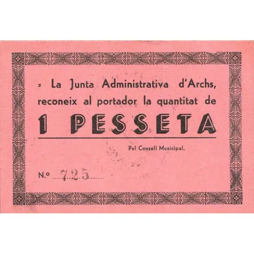 | Ön yüz lejandı | La Junta Administrativa d`Archs, reconeix al portador la quantitat de 1 PESSETA Pel Consell Municipal, (Translation: The Administrative Board of Archs, recognizes te bearer the amount of 1 Peseta For the Municipal Council,) |