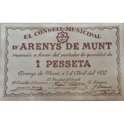 | Obverse lettering | EL CONSELL MUNICIPAL D`ARENYS DE MUNT reconeix a favor del portador la quantitat de 1 PESSETA Arenys de Munt, a 5 d`Abril del 1937 (Translation: The Municipal Council of Arenys de Munt recognizes in favor of the bearer the amount of 1 Peseta Arenys de Munt, on April 5, 1937) |