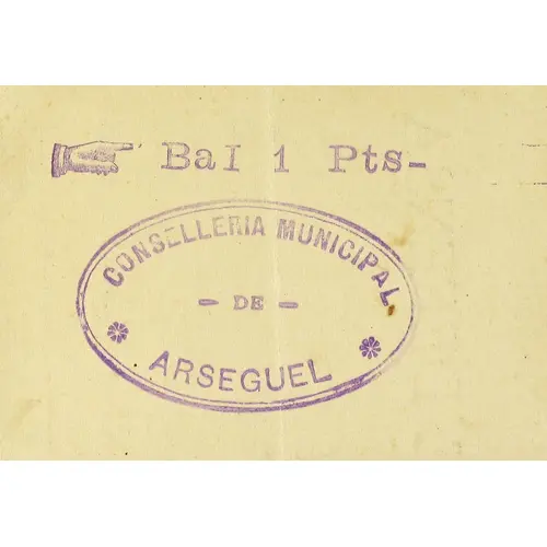 Bal 1 Pts - CONSELLERIA MUNICIPAL DE ARSEGUEL (Translation: Voucher for 1 Peseta Municipal Council of Arseguel) |