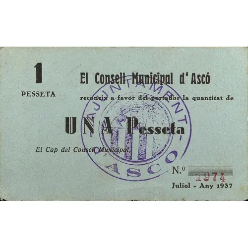 (Translation: 1 Peseta The Municipal Council of Ascó recognizes in favor of the bearer the amount of One Peseta July - Year 1937)