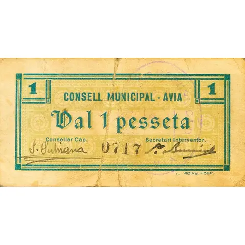 1 CONSELL MUNICIPAL - AVIA Val 50 cèntims (Translation: Municipal Council - Avià Voucher 1 Peseta) |
