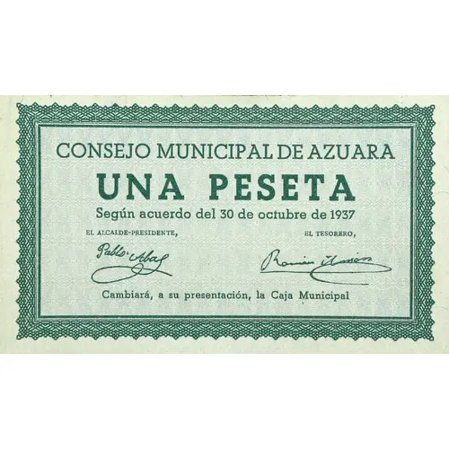 CONSEJO MUNICIPAL DE AZUARA UNA PESETA Según acuerdo del 30 de octubre de 1937 Cambiará, a su presentación, la Caja Municipal (Translation: Municipal Council of Azuara One Peseta According to agreement of October 30, 1937 It will change, at its presentation, the Municipal Fund) |