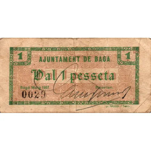 1 AJUNTAMENT DE BAGA Val 1 pesseta Baga Maig 1937 (Translation: City Council of Baga Voucher 1 Peseta Baga, May 1937) |