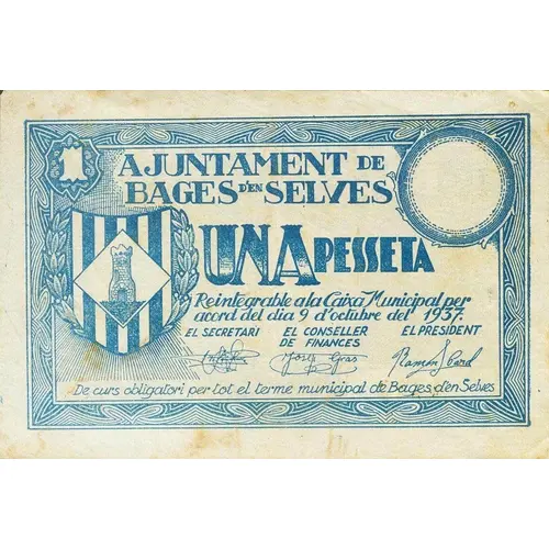1 AJUNTAMENT DE BAGES D`EN SELVES UNA PESSETA Reintegrable a la Caixa Municipal per acord del dia 9 d`octubre del 1937 De curs obligatori per tot el terme municipal de Bages d`en Selves (Translation: City Council of Bages d`en Selves One Peseta Refundable to the `Caixa Municipal` by agreement of October 9, 1937 Mandatory course throughout the municipality of Bages d`en Selves) |