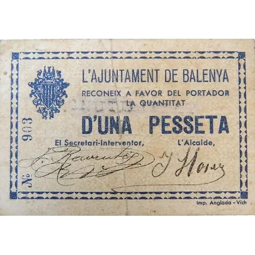 L`AJUNTAMENT DE BALENYA RECONEIX A FAVOR DEL PORTADOR LA QUANTITAT D`UNA PESETA (Translation: The City Council of Balenya Recognizes in favour of the bearer the amount of One Peseta) |
