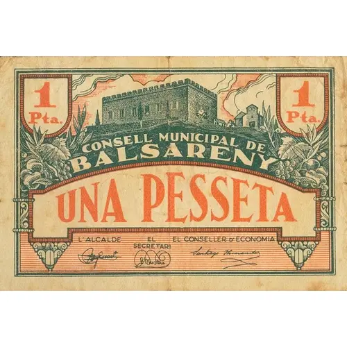 1 Pta. CONSELL MUNICIPAL DE BALSARENY UNA PESSETA (Translation: 1 Peseta Municipal Council of Balsareny One Peseta) |