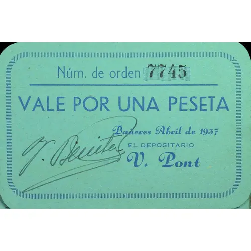 Núm. de orden VALE POR UNA PESETA Bañeres Abril de 1937 (Translation: Number of order Voucher for One Peseta Bañeres April, 1937) |