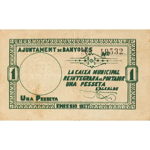 AJUNTAMENT DE BANYOLES 1 LA CAIXA MUNICIPAL REINTEGRARA AL PORTADOR UNA PESSETA UNA PESSETA EMISSIO 1937 (Translation: City Council of Banyoles The `Caixa Municipal` will refund the bearer One Peseta One Peseta Issue 1937) |