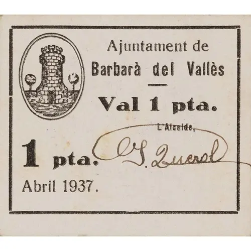 | Obverse lettering | Ajuntament de Barbarà del Vallès Val 1 pta. 1pta. Abril 1937. (Translation: City Council of Barbarà del Vallès It`s worth 1 Peseta 1 Peseta April 1937. Authorized May 1937) |