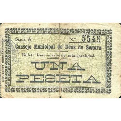 | Obverse lettering | Consejo Municipal de Beas de Segura Billete fraccionario de esta localidad UNA PESETA (Translation: Municipal Council of Beas de Segura Fractional banknote of this town One Peseta) |