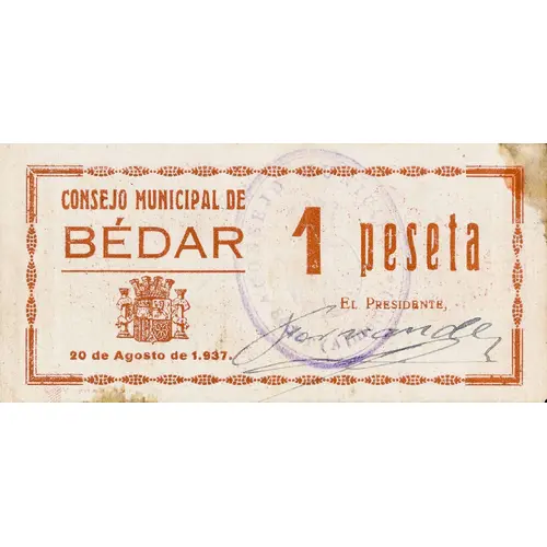 CONSEJO MUNICIPAL DE BÉDAR 1 peseta 20 de Agosto de 1.937 (Translation: Municipal Council of Bédar 1 Peseta August 20, 1937.) |