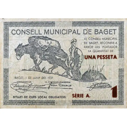 CONSELL MUNICIPAL DE BAGET EL CONSELL MUNICIPAL DE BAGET, RECONEIX A FAVOR DEL PORTADOR LA QUANTITAT DE UNA PESSETA BAGET, 1 DE JUNY DEL 1937 BITLLET DE CURS LOCAL OBLIGATORI (Translation: Municipal Council of Baget The Municipal Council of Baget, recognizes in favor of the bearer the amount of One Peseta Baget, June 1, 1937 Mandatory local course banknote) |