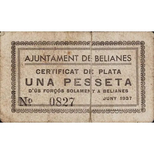 AJUNTAMENT DE BELIANES CERTIFICAT DE PLATA UNA PESSETA D`ÚS FORÇÒS SOLAMENT A BELIANES JUNY 1937 (Translation: City Council of Belianes Silver Certificate One Peseta Mandatory use only in Belianes June 1937) |