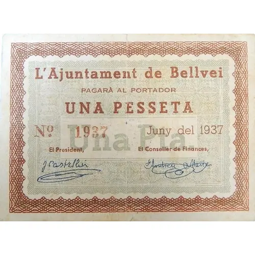 L`Ajuntament de Bellvei PAGARÀ AL PORTADOR UNA PESSETA Juny del 1937 (Translation: The City Council of Bellvei Will pay the bearer One Peseta June 1937) |