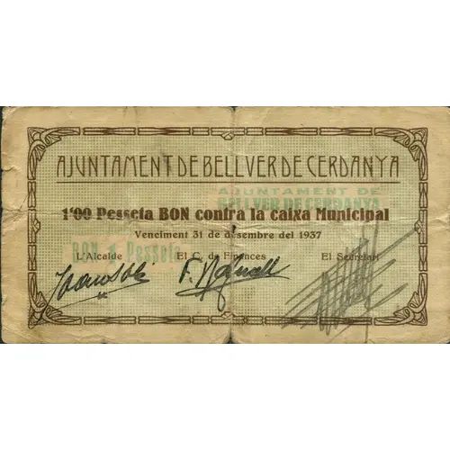 表面の銘文 AJUNTAMENT DE BELLVER DE CERDANYA 1`00 Pesseta BON contra la caixa Municipal Venciment 31 de desembre del 1937
