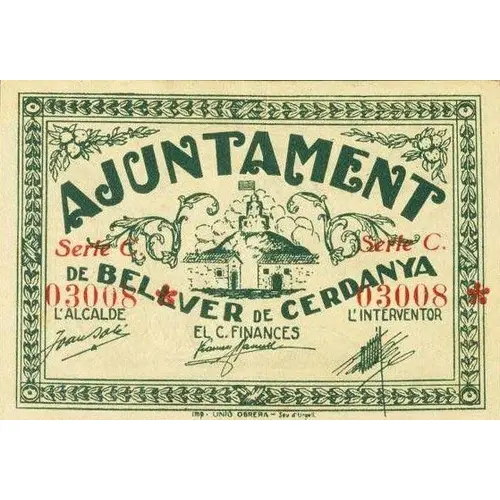UNA PTA BELLVER DE CERDANYA Emissió 17 de Juliol del 1937 Curs obligatori dins el terme municipal Venciment 1er d`agost del 1938 Bitllet a canviar a la caixa municipal abans del dia 10 d`agost del 1938. (Translation: One Peseta Bellver de Cerdanya Issue July 17, 1937 Mandatory course within the municipality Expiration August 1, 1938 (Banknote to be changed in the `Caixa Municipal` before August 10, 1938)) |