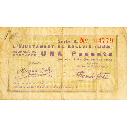 L`AJUNTAMENT DE BELLVIS (Lleida) ABONARÁ AL PORTADOR UNA Pesseta Bellvis, 3 de Gener del 1937 Vàlid dins el terme de Bellvís. Expedit per a suplir la manca de moneda fraccionària. (Translation: The City Council of Bellvis (Lleida) Will pay the bearer One Peseta Bellvis, January 3, 1937 Valid within the term of Bellvís. Issued to make up for the lack of fractional currency.) |